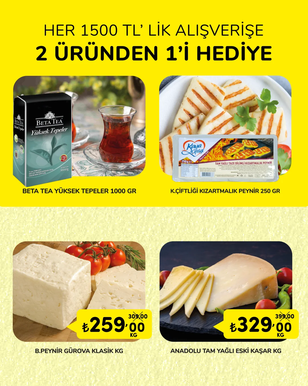 Üstelik her 1500 TL’lik alışverişte Beta Tea Yüksek Tepeler 1000 g veya Kaya Çiftliği Kızartmalık Peynir 250 g HEDİYE!
